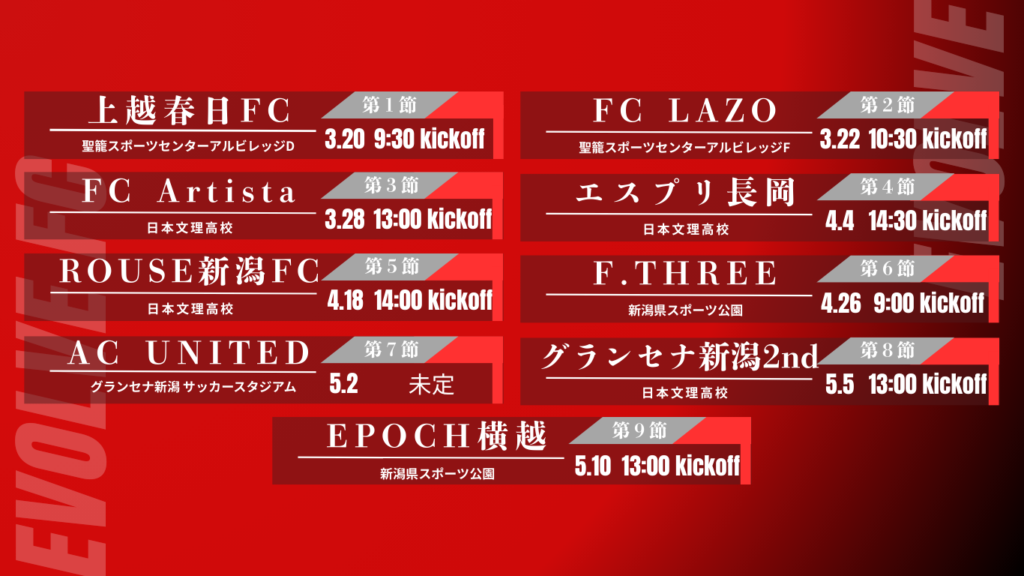 3月20日(金)、新潟聖籠スポーツセンターアルビレッジDピッチにて行われます『高円宮杯 JFA U-15 サッカーリーグ2026 新潟県1部リーグ 第1節 vs 上越春日FC』の試合情報をお知らせいたします。 - 高円宮杯 JFA U-15 サッカーリーグ 新潟県1部リーグ 第1節 2026年3月20日(金) 9:30キックオフ・新潟聖籠スポーツセンターアルビレッジDピッチ エボルブFC vs 上越春日FC - 【試合会場】 新潟聖籠スポーツセンターアルビレッジ https://share.google/4GafBe8OsVSvxfy45