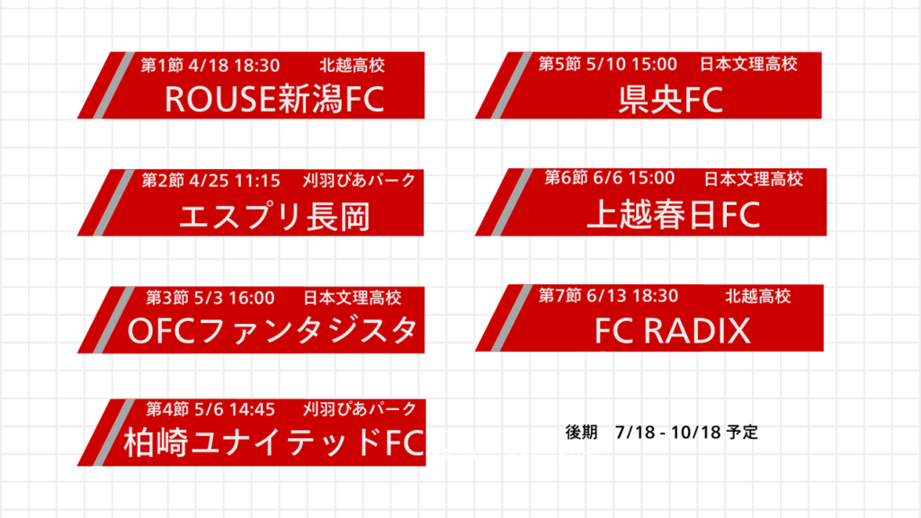 新潟県U-13サッカーリーグ2026 1部リーグ前期日程、キックオフ時刻等が発表されましたので、お知らせいたします。